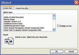 A. There is a tool that does just that. While it lacks the full flexibility of a dynamic calendar tool like the one in Outlook, it’s a handy add-on to Word. To access it, place your insertion point where you want to locate the calendar and click on Insert , Object and select the Create New tab and Calendar Control 11.0 , as shown in the following screenshot:
