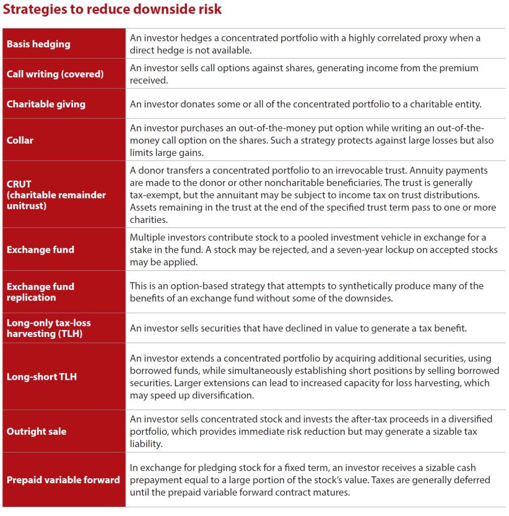 A client may choose to divest, hedge, or diversify a concentrated portfolio, with varying degrees of tax efficiency. (See the chart “Strategies to Reduce Downside Risk,” below.)