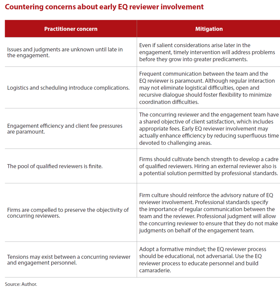 If early EQ reviewer involvement is a panacea, why don’t firms universally adopt this best practice? Practitioner reluctance falls into six broad themes. Some concerns are thornier than others, but progressive firms can use the following suggestions to address apprehension. (See the table, “Countering Concerns About Early EQ Reviewer Involvement,” below.)