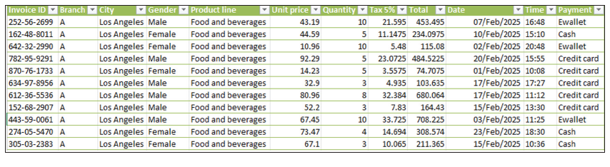 Here, I have a sample dataset of approximately 1,000 rows that is relatively lightweight (in terms of number of records) and “somewhat” clean, with various fields such as date, time, product line, payment method, unit price, quantity, and so on, for analysis. Let’s see how the various tools available to accountants assist us with our work.