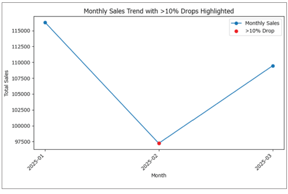 “Using the Power Query output table, group sales by Month, plot the trend line, and highlight months with >10% drop vs. previous month.”