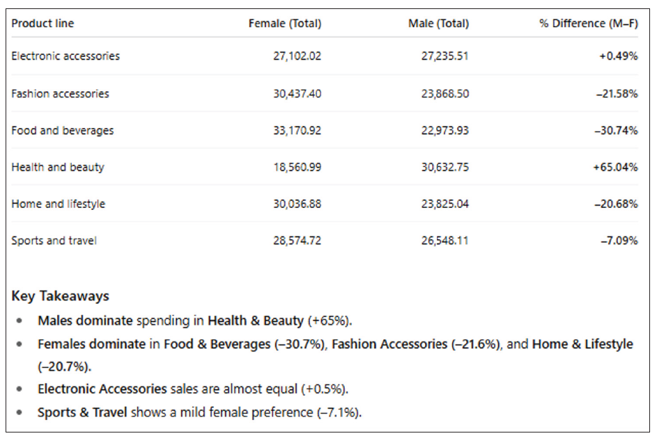 - Customer behavior differences (gender preferences, branch differences).