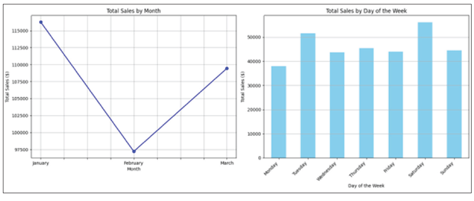 - Sales by day of the week: The sales were relatively consistent across all days of the week, with a notable peak on Saturday and a slightly lower dip on Monday.