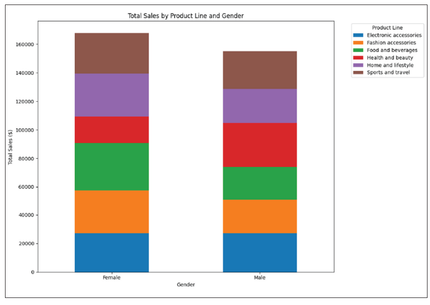 - The total sales for each product line are roughly equal for both genders, suggesting no significant gender-based purchasing trends in this dataset.