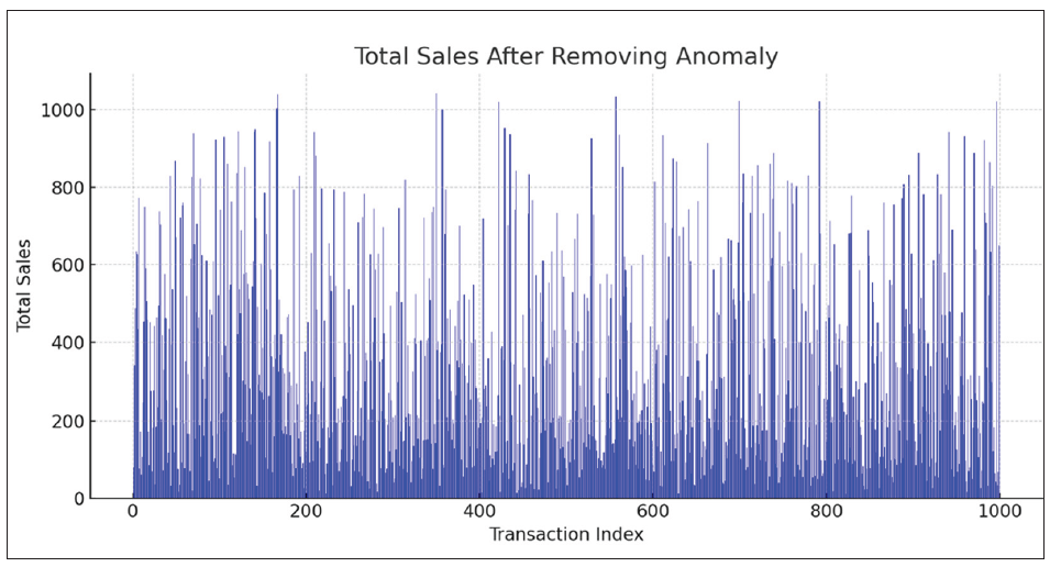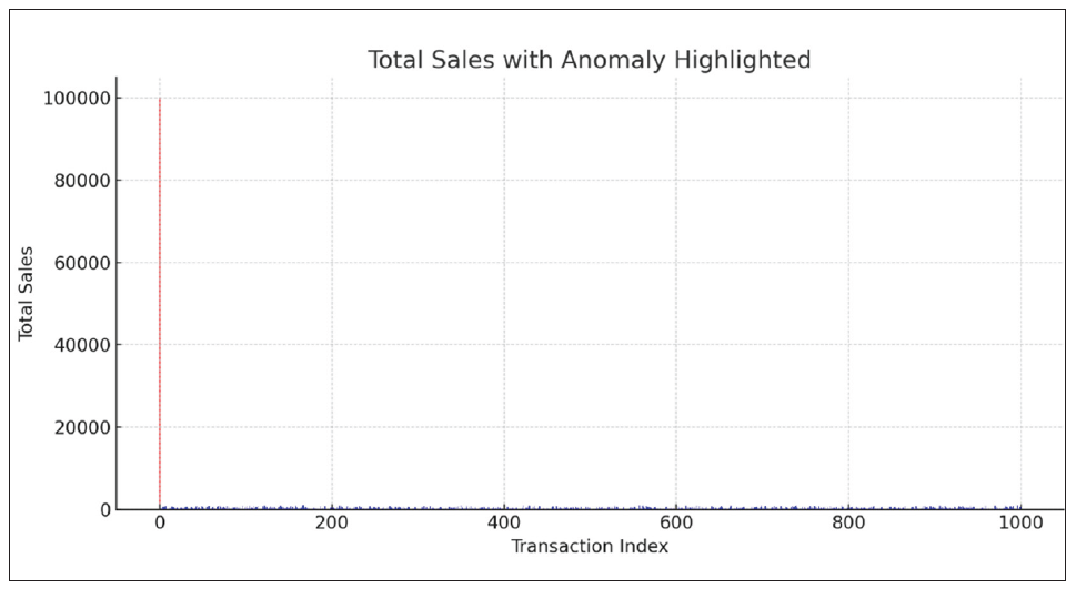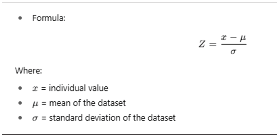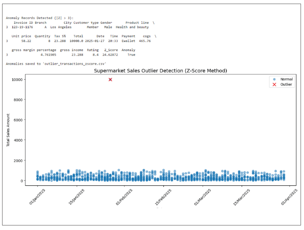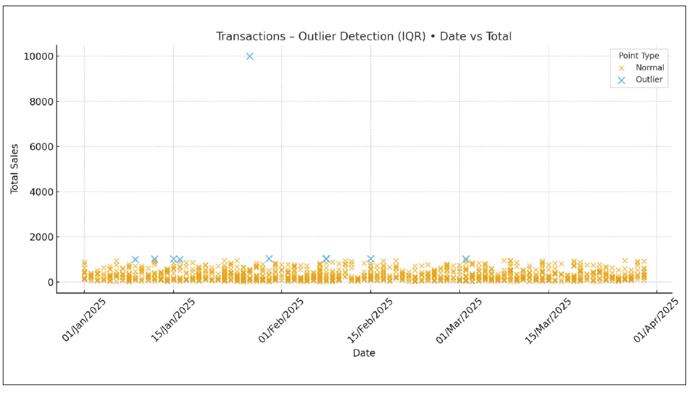If the absolute value of Z is large (commonly > 3), the data point is considered an outlier because it’s unusually far from the average compared to the rest of the data. We may calculate how far each transaction’s Total value is from the average in units of standard deviation. Any transaction with a Z-score above 3 or below -3 would therefore be marked as an anomaly.