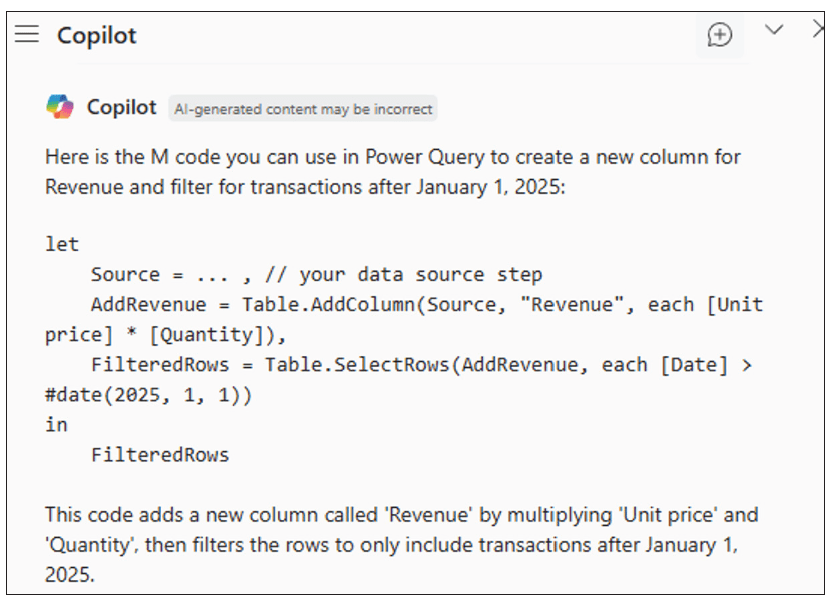“Write the M code to create a new column that calculates Revenue = Unit price * Quantity, then filter for transactions after 1 Jan 2025.”