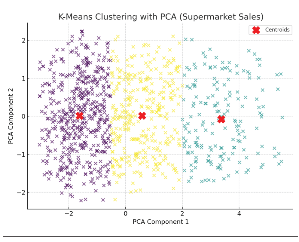 Three clusters were detected after reducing the original features to two principal components. Dots represent transactions, whilst red X markers are known as the cluster centroids. This visualization helps identify similar transaction patterns, such as groups of customers with similar purchase amounts, quantities, or ratings.