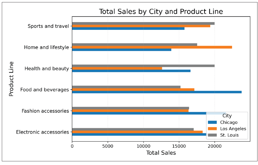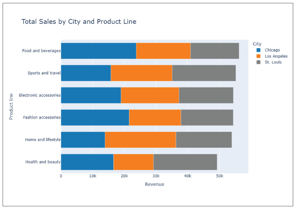 “Show an interactive bar chart of Total Sales by City and Product Line, sorted by highest Sales.”