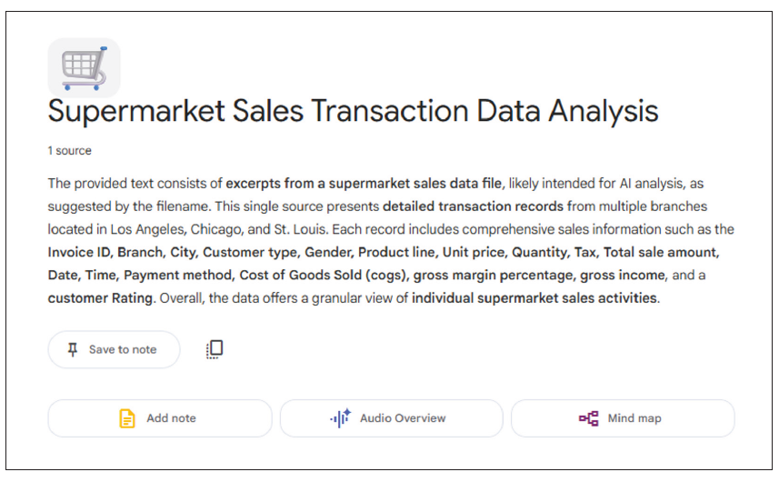 For insight-rich analysis, NotebookLM may be noteworthy. It combines reference-based AI with multidocument context, producing linked insights and citation, e.g., if you convert supermarket_sales.csv to PDF or Google Doc, you may then ask: