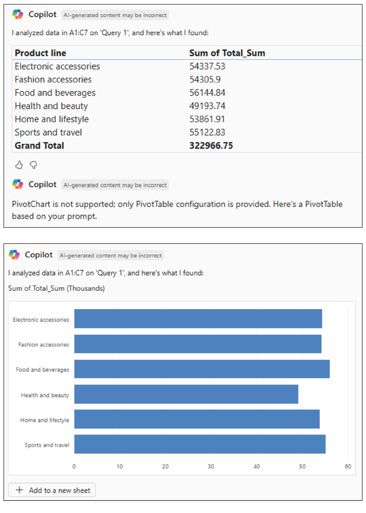 We can then ask Copilot to create the PivotChart using another prompt: